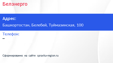 Белэнерго по адресу Башкортостан, Белебей, Туймазинская, 100 в дальнейшем Организация, размещена в следующих категориях:
