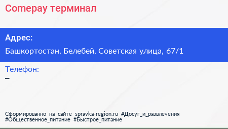 Comepay, терминал по адресу Башкортостан, Белебей, Советская улица, 67/1 в дальнейшем Организация, размещена в следующих категориях: