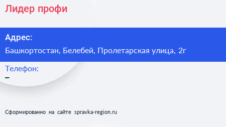 Лидер профи по адресу Башкортостан, Белебей, Пролетарская улица, 2г в дальнейшем Организация, размещена в следующих категориях: