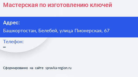 Мастерская по изготовлению ключей по адресу Башкортостан, Белебей, улица Пионерская, 67 в дальнейшем Организация, размещена в следующих категориях: