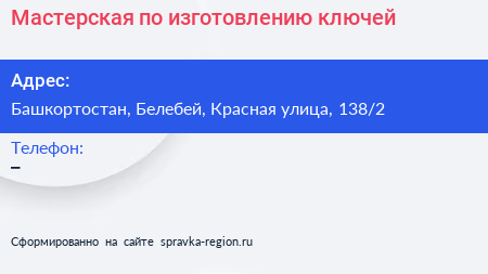 Мастерская по изготовлению ключей по адресу Башкортостан, Белебей, Красная улица, 138/2 в дальнейшем Организация, размещена в следующих категориях: