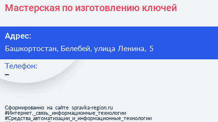 Мастерская по изготовлению ключей по адресу Башкортостан, Белебей, улица Ленина, 5 в дальнейшем Организация, размещена в следующих категориях: