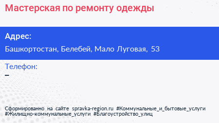 Мастерская по ремонту одежды по адресу Башкортостан, Белебей, Мало Луговая, 53 в дальнейшем Организация, размещена в следующих категориях: