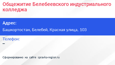 Общежитие, Белебеевского индустриального колледжа по адресу Башкортостан, Белебей, Красная улица, 103 в дальнейшем Организация, размещена в следующих категориях: