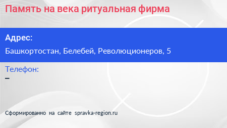 Память на века, ритуальная фирма по адресу Башкортостан, Белебей, Революционеров, 5 в дальнейшем Организация, размещена в следующих категориях: