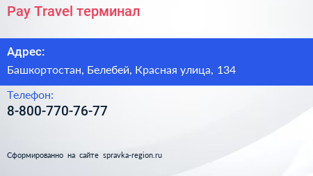 Pay. Travel, терминал по адресу Башкортостан, Белебей, Красная улица, 134 в дальнейшем Организация, размещена в следующих категориях:
