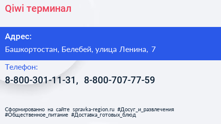 Qiwi, терминал по адресу Башкортостан, Белебей, улица Ленина, 7 в дальнейшем Организация, размещена в следующих категориях: