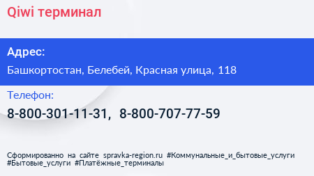 Qiwi, терминал по адресу Башкортостан, Белебей, Красная улица, 118 в дальнейшем Организация, размещена в следующих категориях: