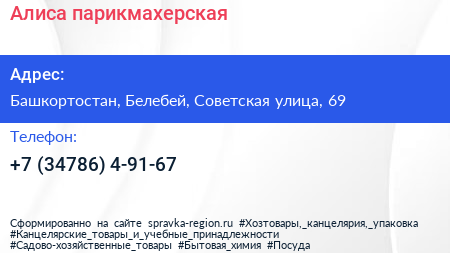 Алиса, парикмахерская по адресу Башкортостан, Белебей, Советская улица, 69 в дальнейшем Организация, размещена в следующих категориях: