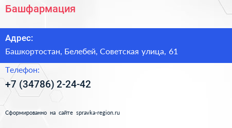 Башфармация по адресу Башкортостан, Белебей, Советская улица, 61 в дальнейшем Организация, размещена в следующих категориях: