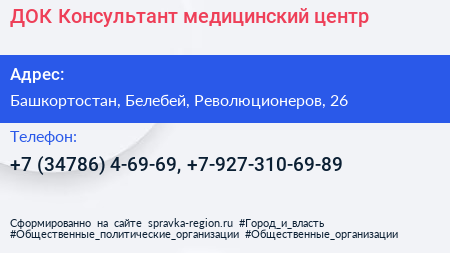 ДОК-Консультант, медицинский центр по адресу Башкортостан, Белебей, Революционеров, 26 в дальнейшем Организация, размещена в следующих категориях: