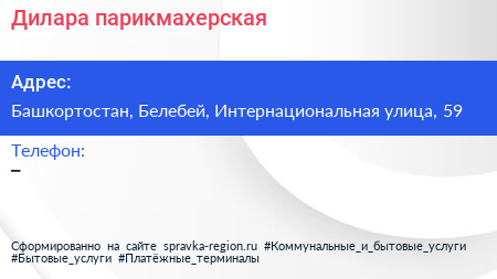 Дилара, парикмахерская по адресу Башкортостан, Белебей, Интернациональная улица, 59 в дальнейшем Организация, размещена в следующих категориях:
