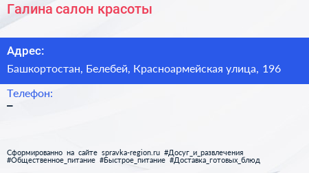 Галина, салон красоты по адресу Башкортостан, Белебей, Красноармейская улица, 196 в дальнейшем Организация, размещена в следующих категориях: