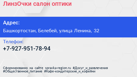 ЛинзОчки, салон оптики по адресу Башкортостан, Белебей, улица Ленина, 32 в дальнейшем Организация, размещена в следующих категориях: