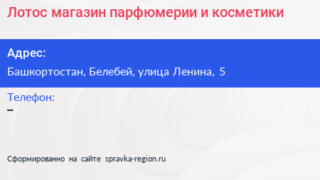 Лотос, магазин парфюмерии и косметики по адресу Башкортостан, Белебей, улица Ленина, 5 в дальнейшем Организация, размещена в следующих категориях: