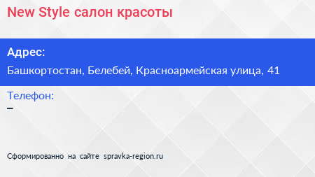 New Style, салон красоты по адресу Башкортостан, Белебей, Красноармейская улица, 41 в дальнейшем Организация, размещена в следующих категориях: