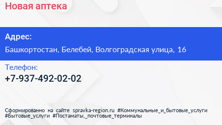 Новая, аптека по адресу Башкортостан, Белебей, Волгоградская улица, 16 в дальнейшем Организация, размещена в следующих категориях:
