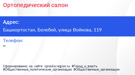 Ортопедический салон по адресу Башкортостан, Белебей, улица Войкова, 119 в дальнейшем Организация, размещена в следующих категориях: