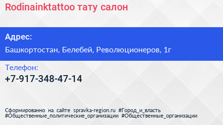 Rodinainktattoo, тату-салон по адресу Башкортостан, Белебей, Революционеров, 1г в дальнейшем Организация, размещена в следующих категориях: