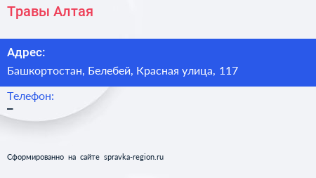 Травы Алтая по адресу Башкортостан, Белебей, Красная улица, 117 в дальнейшем Организация, размещена в следующих категориях: