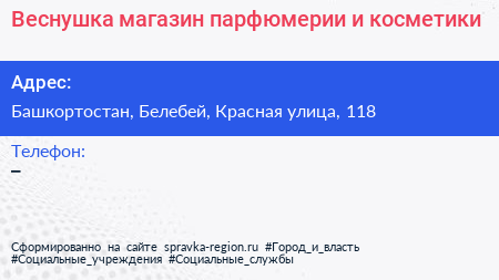 Веснушка, магазин парфюмерии и косметики по адресу Башкортостан, Белебей, Красная улица, 118 в дальнейшем Организация, размещена в следующих категориях: