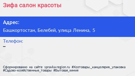 Зифа, салон красоты по адресу Башкортостан, Белебей, улица Ленина, 5 в дальнейшем Организация, размещена в следующих категориях: