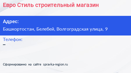 Евро Стиль, строительный магазин по адресу Башкортостан, Белебей, Волгоградская улица, 9 в дальнейшем Организация, размещена в следующих категориях: