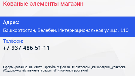 Кованые элементы, магазин по адресу Башкортостан, Белебей, Интернациональная улица, 110 в дальнейшем Организация, размещена в следующих категориях: