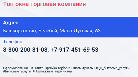 Топ-окна, торговая компания по адресу Башкортостан, Белебей, Мало Луговая, 63 в дальнейшем Организация, размещена в следующих категориях: