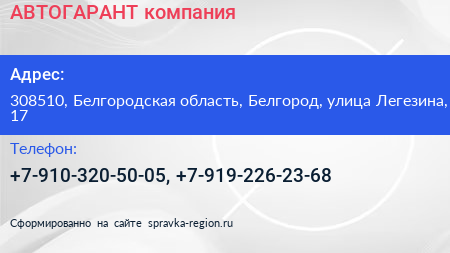 АВТОГАРАНТ, компания по адресу 308510, Белгородская область, Белгород, улица Легезина, 17 в дальнейшем Организация, размещена в следующих категориях: