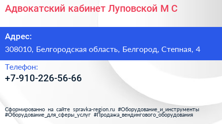 Адвокатский кабинет Луповской М.С. по адресу 308010, Белгородская область, Белгород, Степная, 4 в дальнейшем Организация, размещена в следующих категориях: