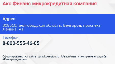 Акс Финанс, микрокредитная компания по адресу 308510, Белгородская область, Белгород, проспект Ленина, 4а в дальнейшем Организация, размещена в следующих категориях: