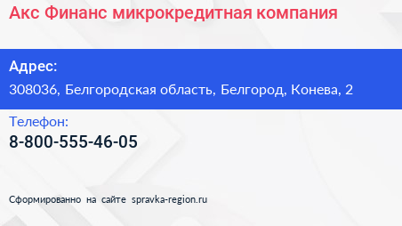 Акс Финанс, микрокредитная компания по адресу 308036, Белгородская область, Белгород, Конева, 2 в дальнейшем Организация, размещена в следующих категориях: