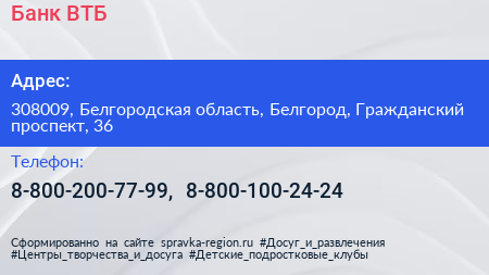 Банк ВТБ по адресу 308009, Белгородская область, Белгород, Гражданский проспект, 36 в дальнейшем Организация, размещена в следующих категориях: