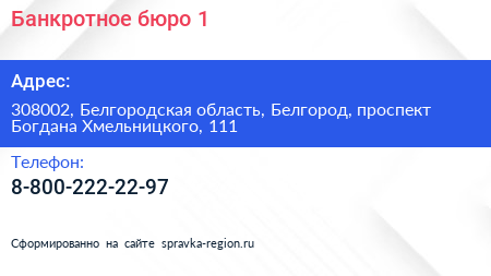 Банкротное бюро №1 по адресу 308002, Белгородская область, Белгород, проспект Богдана Хмельницкого, 111 в дальнейшем Организация, размещена в следующих категориях: