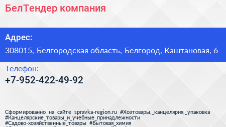 БелТендер, компания по адресу 308015, Белгородская область, Белгород, Каштановая, 6 в дальнейшем Организация, размещена в следующих категориях: