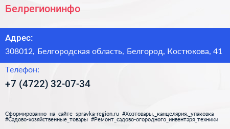 Белрегионинфо по адресу 308012, Белгородская область, Белгород, Костюкова, 41 в дальнейшем Организация, размещена в следующих категориях: