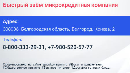 Быстрый заём, микрокредитная компания по адресу 308036, Белгородская область, Белгород, Конева, 2 в дальнейшем Организация, размещена в следующих категориях: