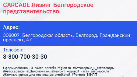 CARCADE Лизинг, Белгородское представительство по адресу 308009, Белгородская область, Белгород, Гражданский проспект, 47 в дальнейшем Организация, размещена в следующих категориях: