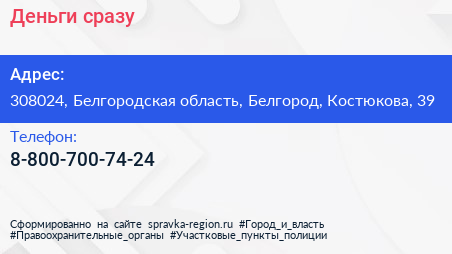 Деньги сразу по адресу 308024, Белгородская область, Белгород, Костюкова, 39 в дальнейшем Организация, размещена в следующих категориях: