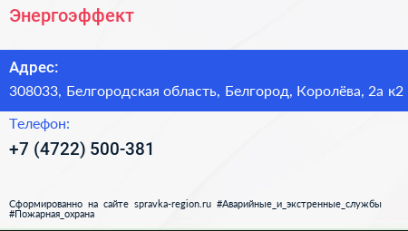 Энергоэффект по адресу 308033, Белгородская область, Белгород, Королёва, 2а к2 в дальнейшем Организация, размещена в следующих категориях: