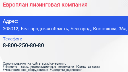 Европлан, лизинговая компания по адресу 308012, Белгородская область, Белгород, Костюкова, 36д в дальнейшем Организация, размещена в следующих категориях: