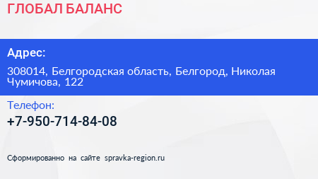 ГЛОБАЛ БАЛАНС по адресу 308014, Белгородская область, Белгород, Николая Чумичова, 122 в дальнейшем Организация, размещена в следующих категориях: