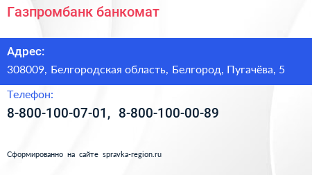 Газпромбанк, банкомат по адресу 308009, Белгородская область, Белгород, Пугачёва, 5 в дальнейшем Организация, размещена в следующих категориях: