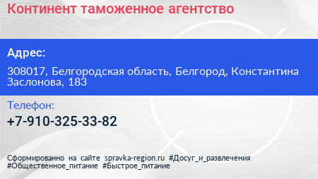 Континент, таможенное агентство по адресу 308017, Белгородская область, Белгород, Константина Заслонова, 183 в дальнейшем Организация, размещена в следующих категориях: