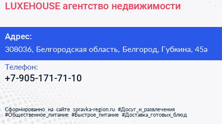 LUXEHOUSE, агентство недвижимости по адресу 308036, Белгородская область, Белгород, Губкина, 45а в дальнейшем Организация, размещена в следующих категориях: