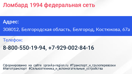 Ломбард-1994-, федеральная сеть по адресу 308012, Белгородская область, Белгород, Костюкова, 67а в дальнейшем Организация, размещена в следующих категориях: