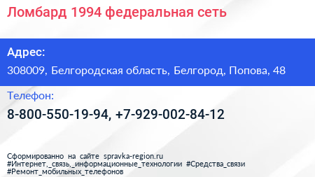 Ломбард-1994-, федеральная сеть по адресу 308009, Белгородская область, Белгород, Попова, 48 в дальнейшем Организация, размещена в следующих категориях:
