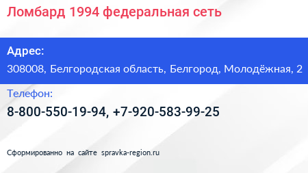 Ломбард-1994-, федеральная сеть по адресу 308008, Белгородская область, Белгород, Молодёжная, 2 в дальнейшем Организация, размещена в следующих категориях: