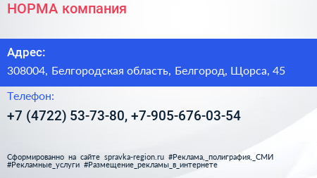 НОРМА, компания по адресу 308004, Белгородская область, Белгород, Щорса, 45 в дальнейшем Организация, размещена в следующих категориях: